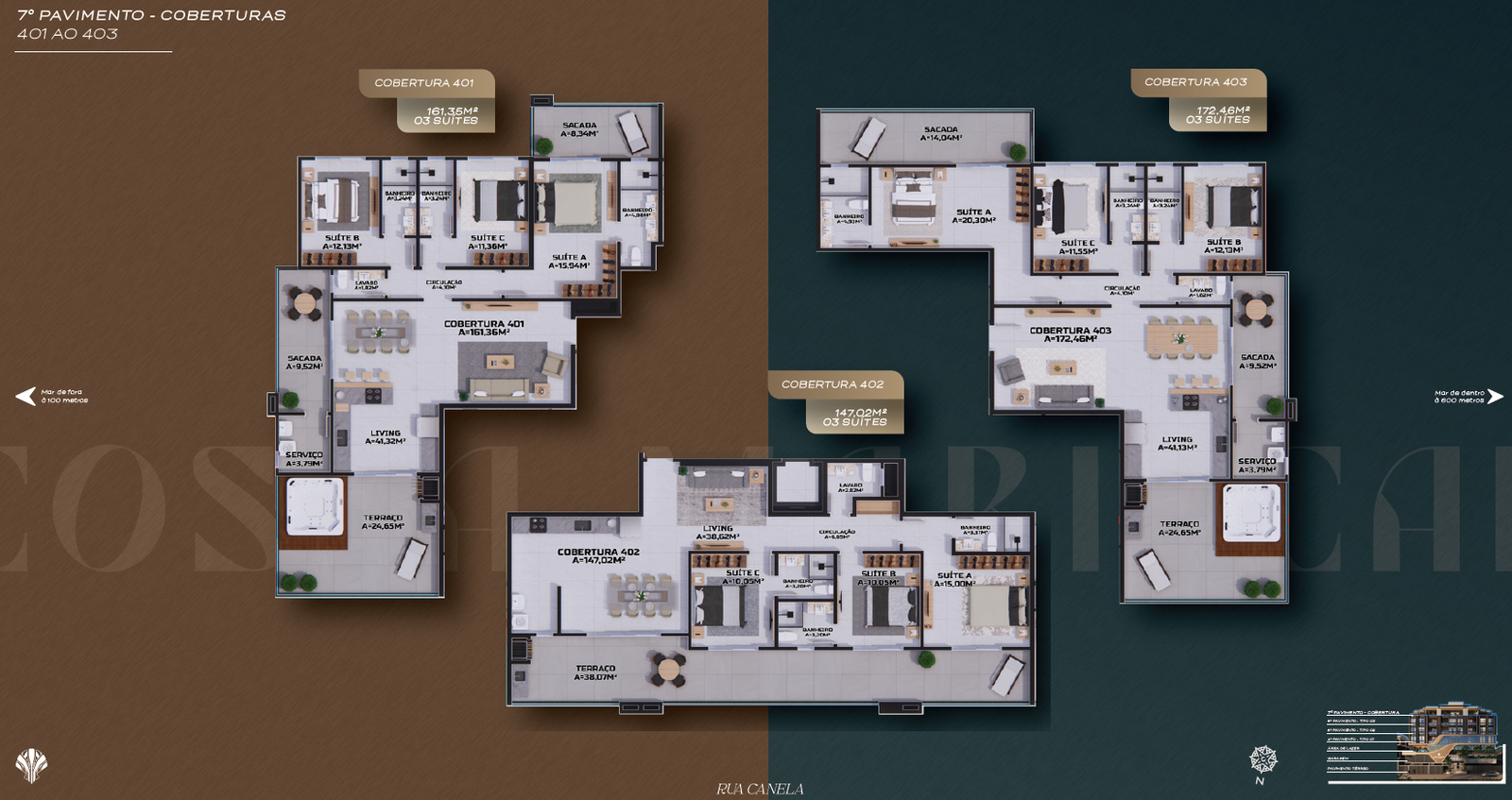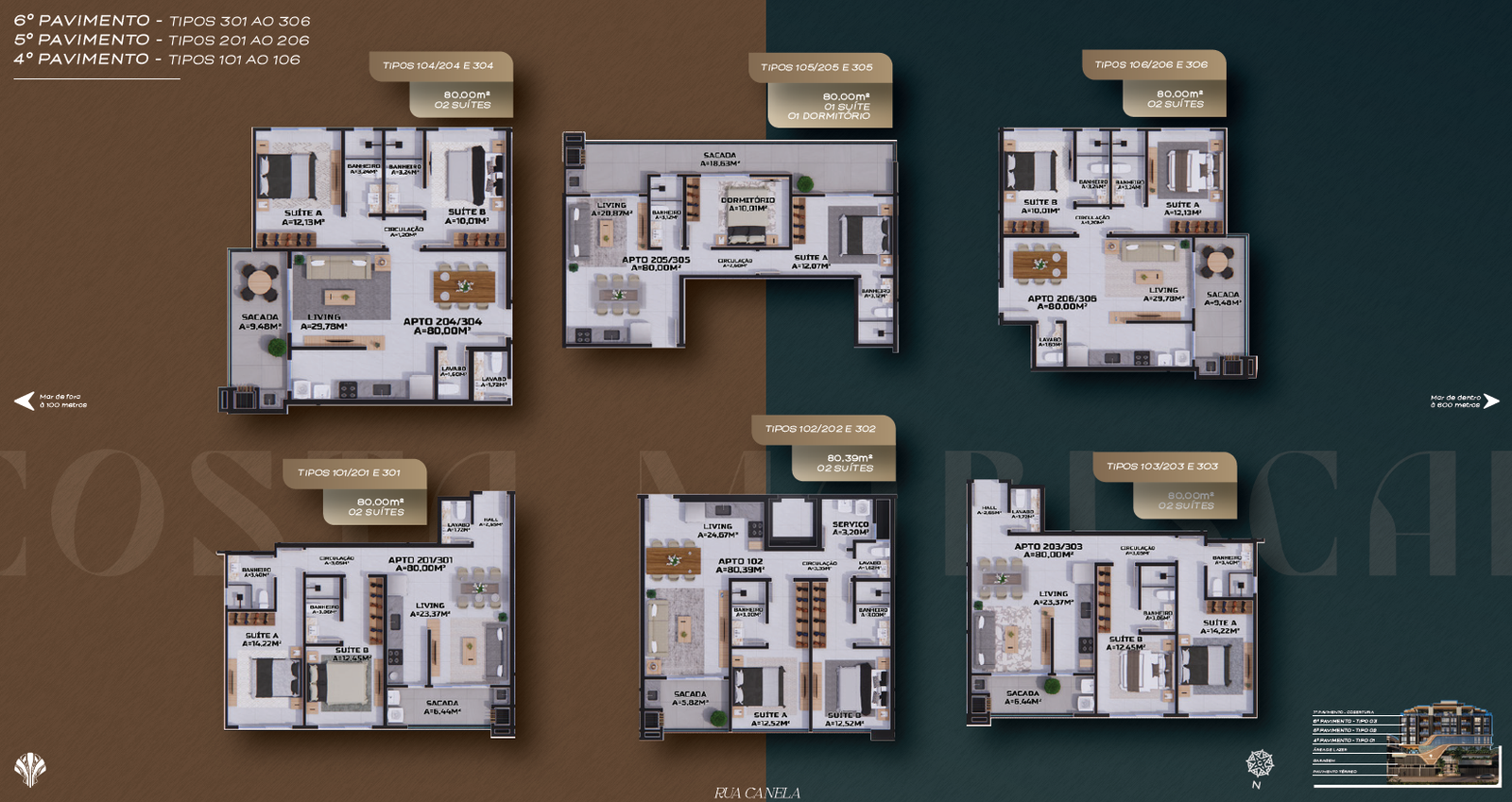 Unidades: apartamentos tipo a partir de 80 m² (2 suítes / 1 suíte + 1 dormitório) e coberturas privativas de até 172,5 m² (3 suítes).