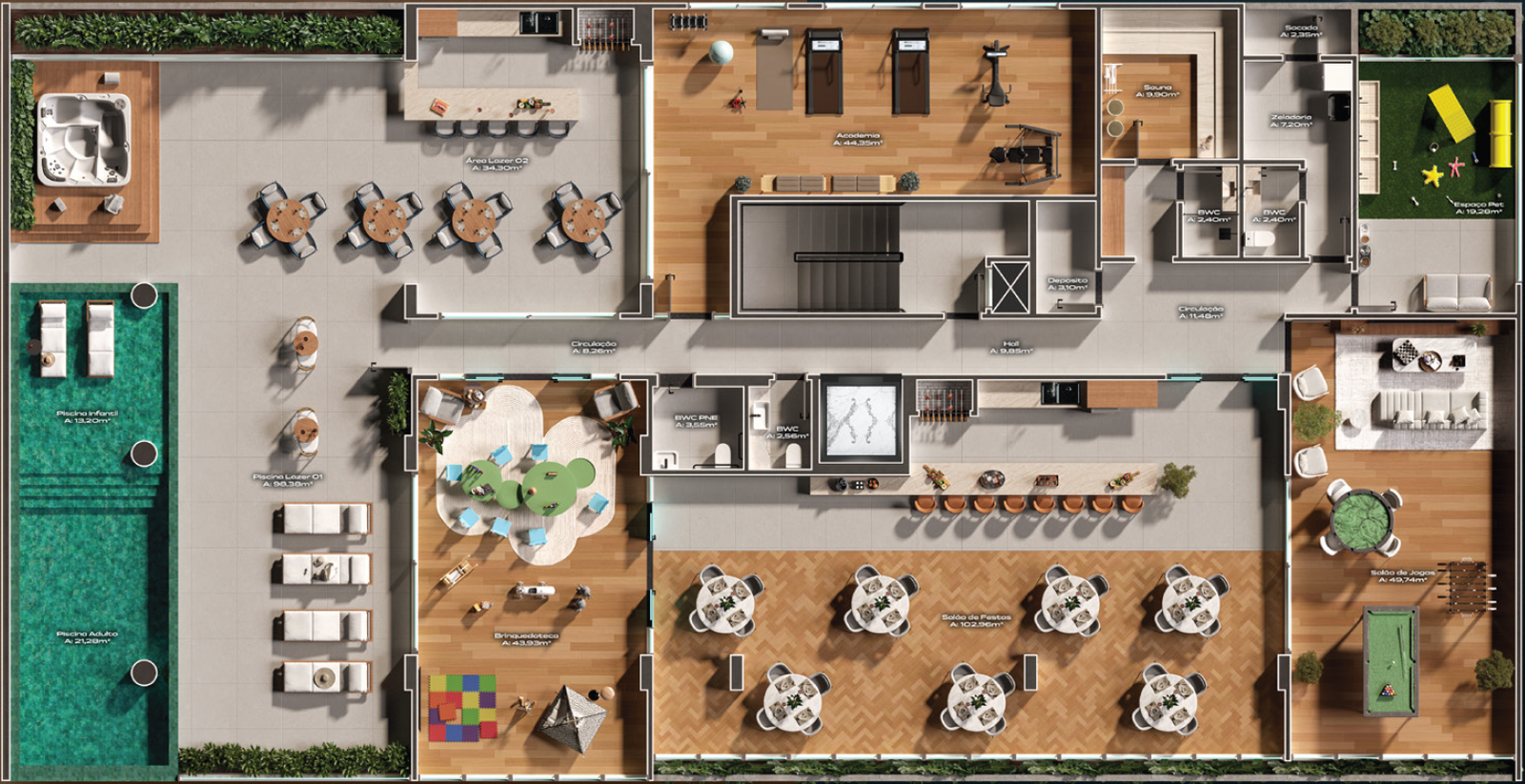 Área de lazer com piscina externa, spa aquecido, sauna a vapor, academia, salão de festas, salão de jogos, espaço gourmet, brinquedoteca, espaço pet e mais.