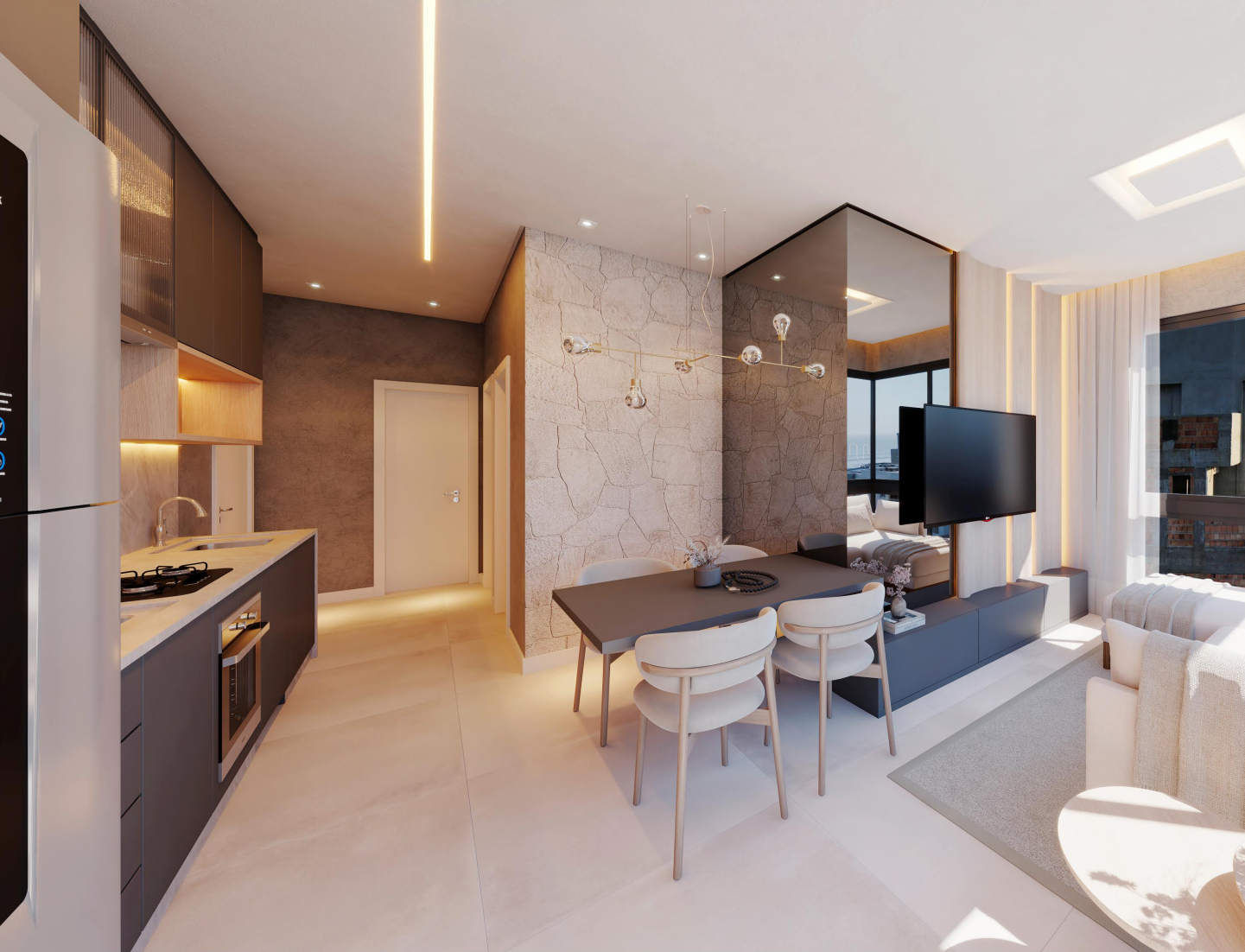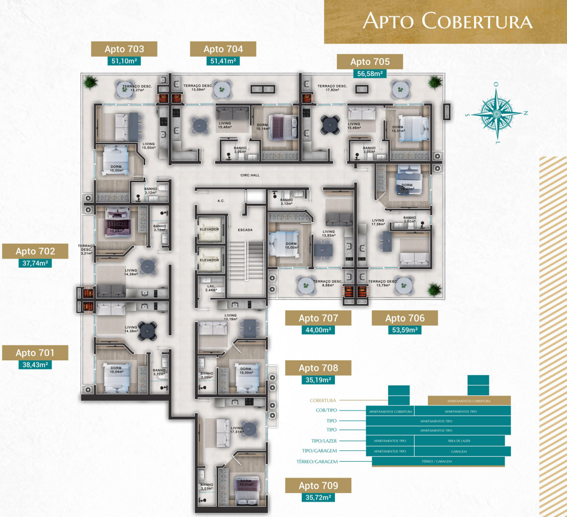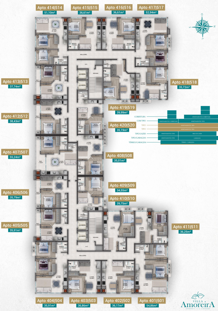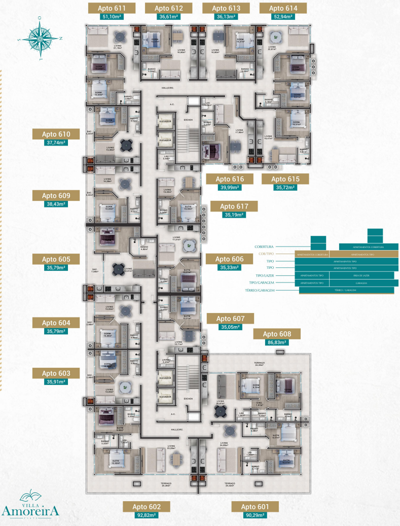 • Plantas versáteis: Opções de apartamentos de 1 a 2 dormitórios, com metragens entre 35m² a 90m².